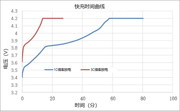 電池高倍率還有一個意義就是能夠進行快充,而普通電池如果進行快充的話易造成負極析鋰,導致電池性能衰減加快,嚴重時可造成電池內部短路,發生起火爆炸。高倍率電芯3C充滿只需要25min,普通電芯1C充電則需要80min以上,如下圖所示,充電時間可以節省60%以上。