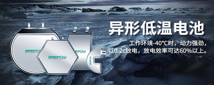 • 格瑞普異形低溫電池在工作環境-40℃時,仍然動力強勁,以0.2C放電,放電效率可達60%以上。